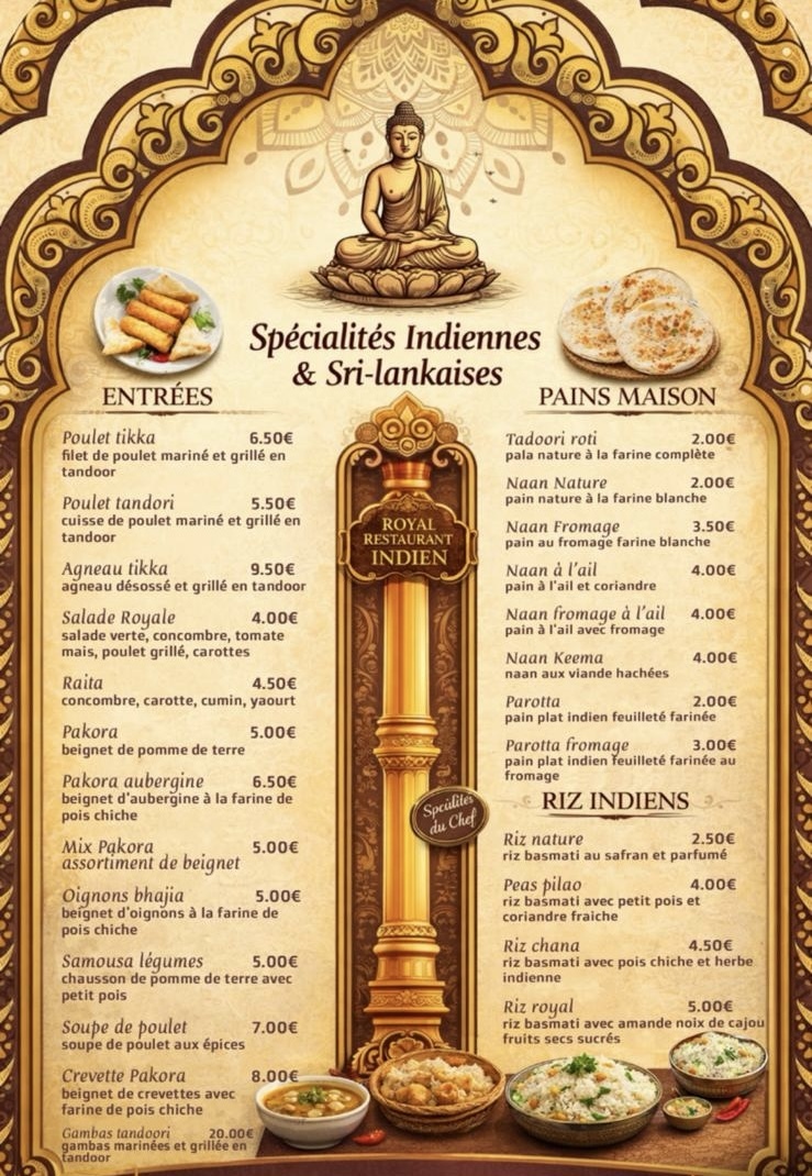 Bienvenue au Royal Restaurant Indien, votre adresse incontournable pour savourer une cuisine indienne authentique. Notre établissement vous invite à découvrir des plats traditionnels préparés avec passion, inspirés des recettes ancestrales du sous‑continent indien.